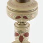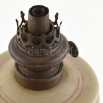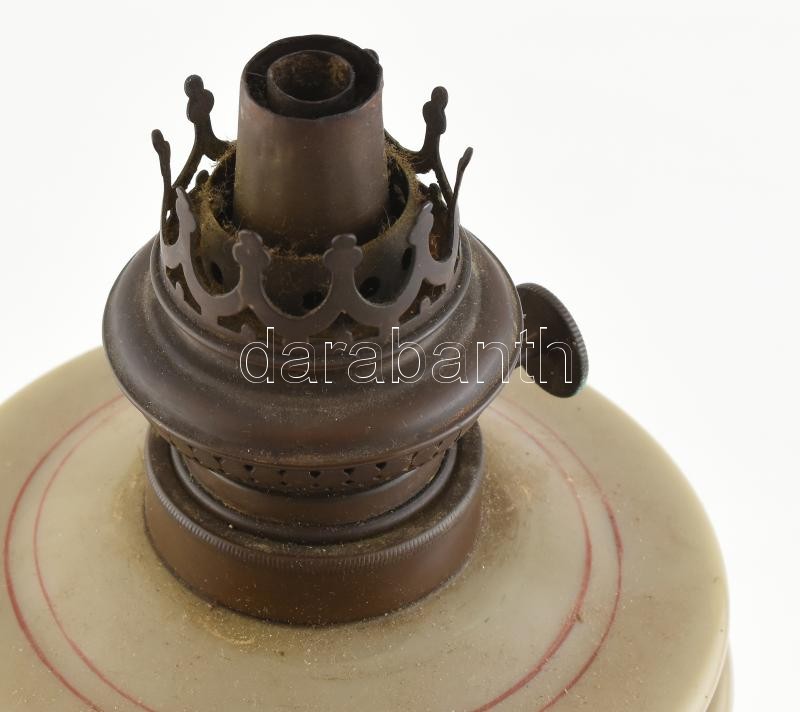 Petróleum lámpa test, huta tejüveg, zománc festett virágokkal, kopott, jelzett lámpafej: KOSMOS-BRENNER, 1890 körül, m:35cm<a href="https://www.darabanth.com/hu/gyorsarveres/414/kategoriak~Porcelan-keramia-uveg/Uvegtargyak~500007/Petroleum-lampa-tes