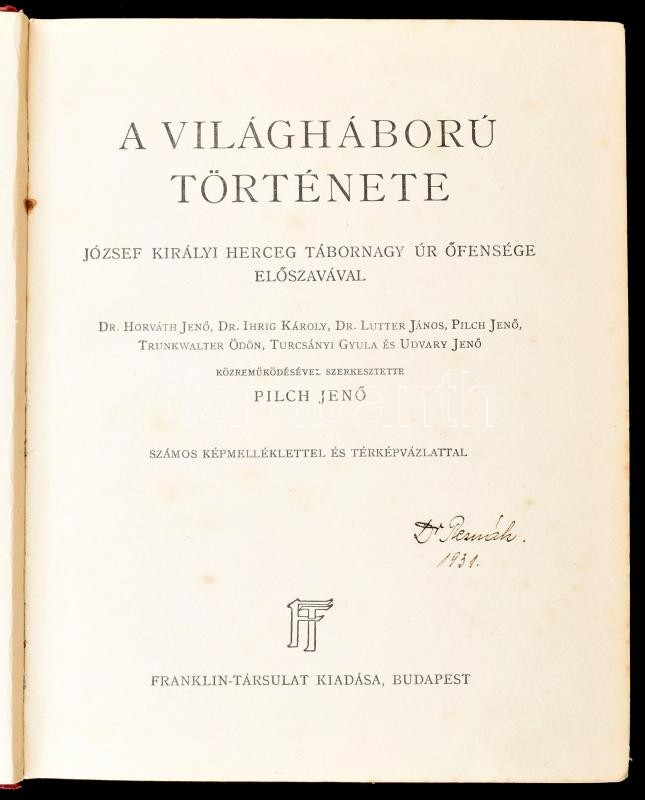 Pilch Jenő (szerk.): A világháború története. József királyi herceg tábornagy úr őfensége előszavával. Bp., é.n. [1928], Franklin. Számos fekete-fehér képmellékletekkel, és térképvázlatokkal, időrendi táblázatokkal (mellékletek.) Kiadói díszes, dúsan aran