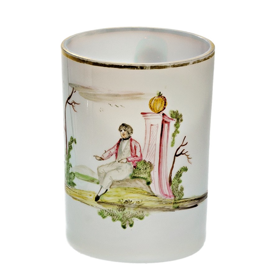 osztrák, 19. sz. közepe, tejüveg, zománcfestett díszitéssel, pereme aranyozva, füllel, m: 8, 7 cm