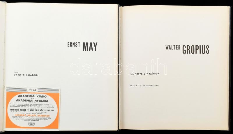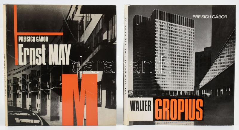 Preisich Gábor 2 könyve: Walter Gropius; Ernst May. Architektúra sorozat. Szerk.: Major Máté. Bp., 1972-1983, Akadémiai Kiadó. Kiadói nylon-kötés, kiadói papír védőborítóban.