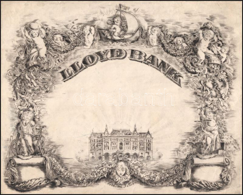 Prihoda István (1891-1956): Lloyd Bank részvényterv, rézkarc, papír, jelzett, szélein szakadásokkal, gyűrődésekkel, 27×34 cm<a href="https://www.darabanth.com/hu/gyorsarveres/438/kategoriak~Festmenyek-es-grafikak/Festmenyek-es-grafikak~500001/Prihod