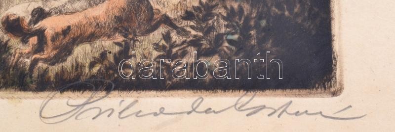Prihoda István (1891-1965): Majális. Színezett rézkarc, papír, jelzett. Lapon apró foltokkal. Üvegezett fakeretben. 25×32 cm<a href="https://www.darabanth.com/hu/gyorsarveres/427/kategoriak~Festmenyek-es-grafikak/Festmenyek-es-grafikak~500001/Prihod