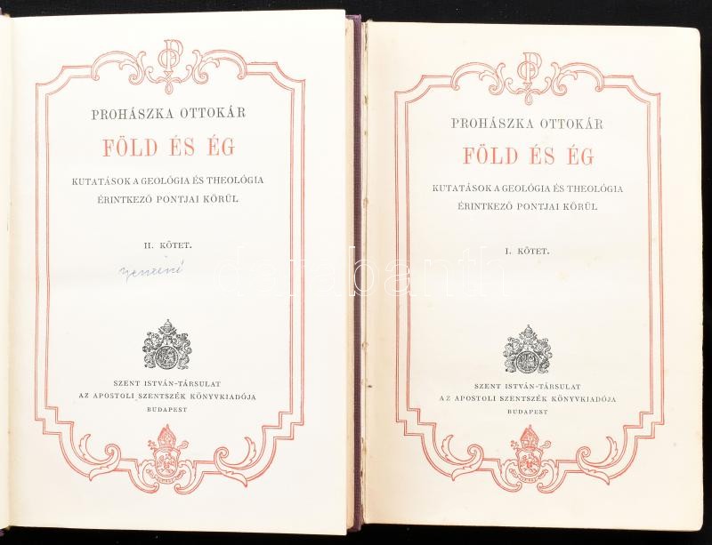 Prohászka Ottokár: Föld és ég. I-II. köt. Prohászka Ottokár összegyűjtött munkái III-IV. Szerk.: Schütz Antal. Bp., 1927, Szent István-Társulat. Kiadói aranyozott egészvászon-kötés, kissé sérült, kopott gerinccel, néhány lap kissé foltos.<a href="ht