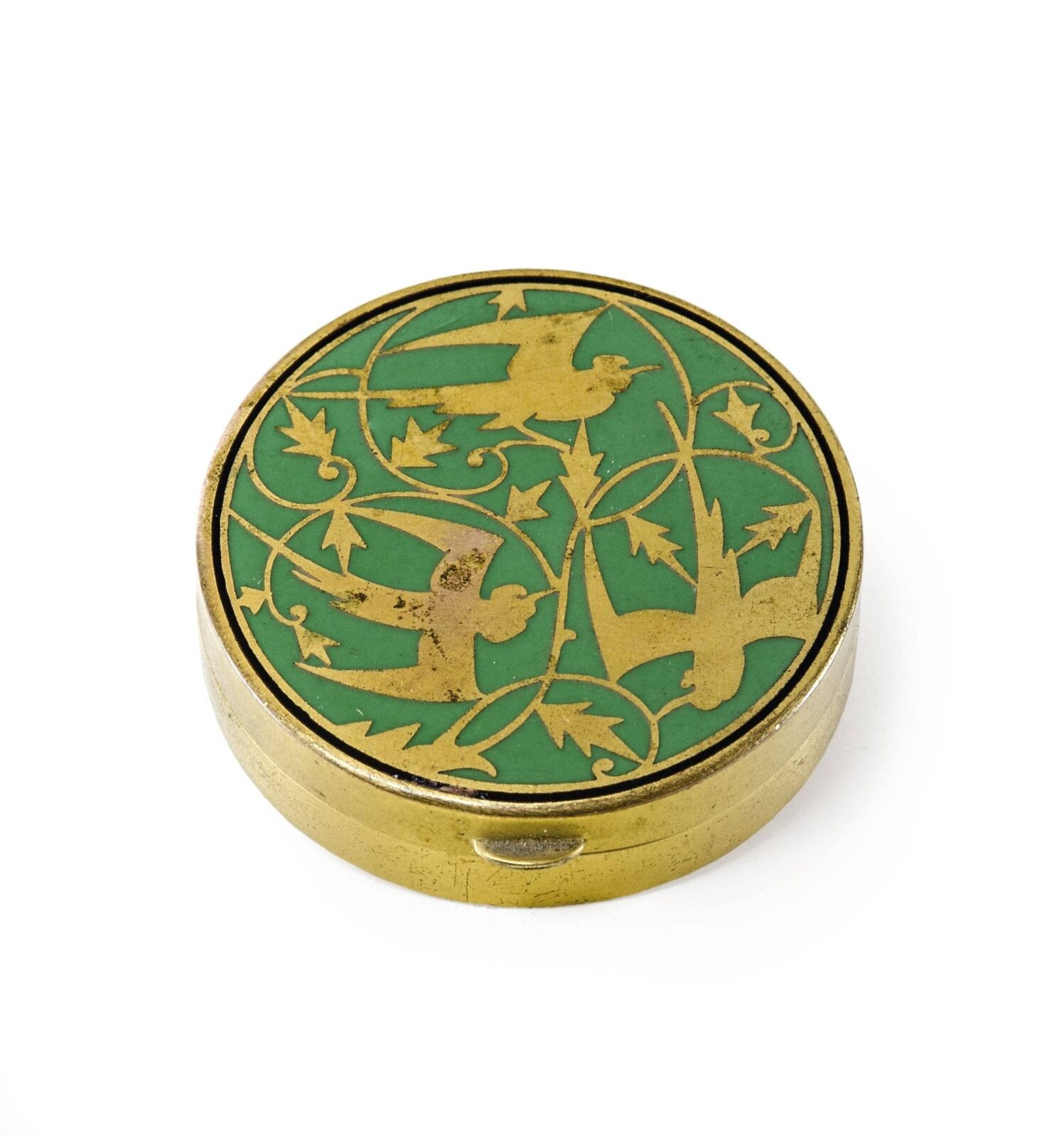 német, 20. század első fele, sárgaréz, zománcfestett díszítéssel, kopott, d: 5 cm
