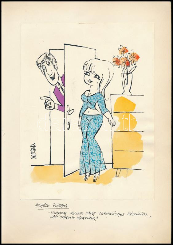 Pusztai Pál (1919-1970): Estélyi pizsama (erotikus karikatúra). Akvarell, tus, papír. Jelezve balra lent. Papírra kasírozva. 21,5×16,5 cm<a href="https://www.darabanth.com/hu/gyorsarveres/431/kategoriak~Festmenyek-es-grafikak/Festmenyek-es-grafikak~