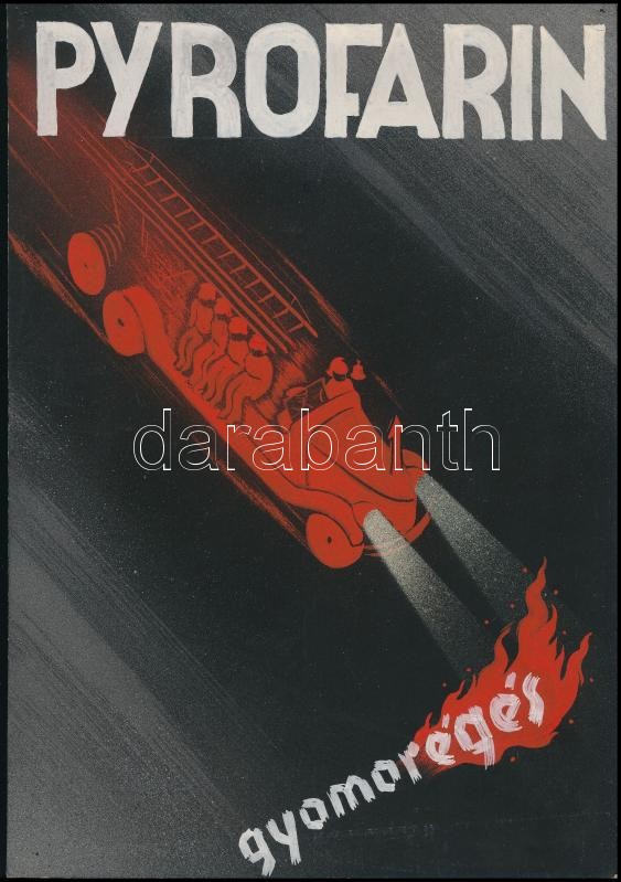 Pyrofarin, plakát- vagy reklámterv, 1935-40 körül. Tempera, papír. Jelzés nélkül, feltehetően Börtsök László (?-?) grafikus műve. 30×20,5 cm.<a href="https://www.darabanth.com/hu/gyorsarveres/410/kategoriak~Mutargy-papirregiseg-egyeb/Plakat~1000004/