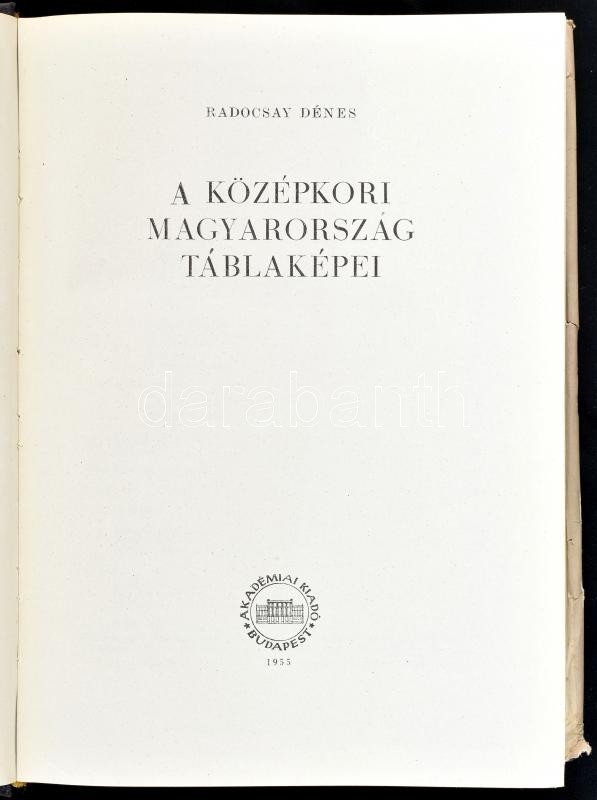 Radocsay Dénes: A középkori Magyarország táblaképei. Bp., 1955., Akadémiai Kiadó, 534+1 p.+CCXXXIX (fekete-fehér képtáblák) t. Kiadói aranyozott egészvászon-kötés, kiadói papír védőborítóban, a papírborítón kis