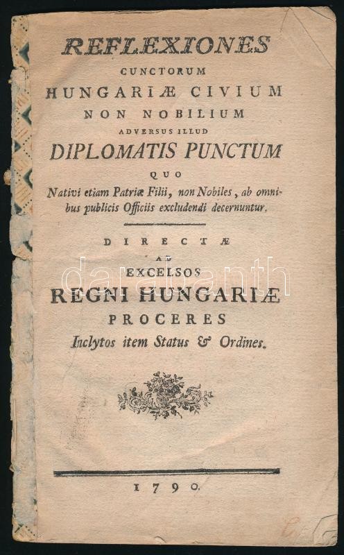 Reflexiones cunctorum Hungariae civium non nobilium adversus illud diplomatis punctum (…). 1790. Papírkötésben, kopottas állapotban.