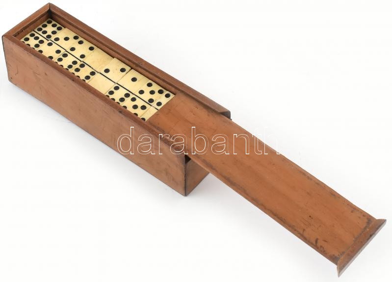 Régi dominókészlet, csont és fa, dobozban, korának megfelelő állapotban, 18,5x5x5 cm<a href="https://www.darabanth.com/hu/gyorsarveres/415/kategoriak~Mutargy-papirregiseg-egyeb/Jatekok~500013/Regi-dominokeszlet-csont-es-fa-dobozban-koranak-megfelelo
