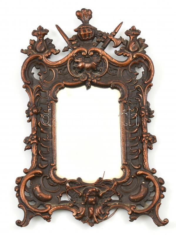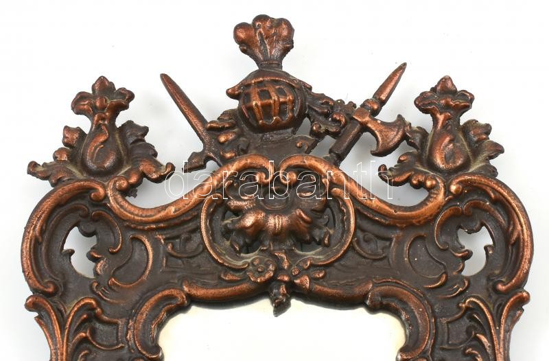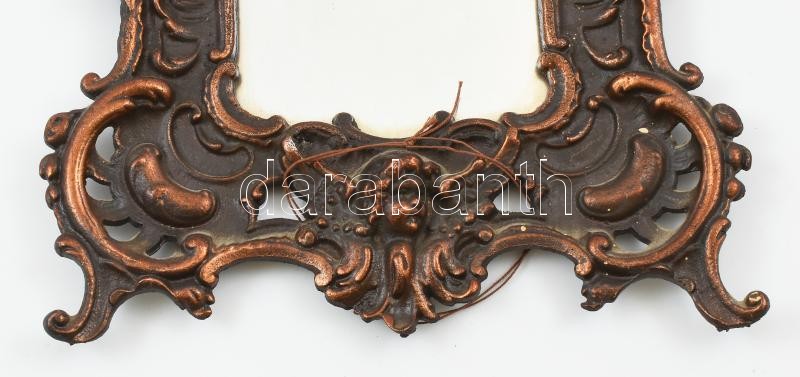 Régi fém, tükör / képkeretnek is használható, falra akasztható, szép állapotban, neorokkokós, puttós és lovag motívummal, 14×10 / 33×22 cm<a href="https://www.darabanth.com/hu/gyorsarveres/421/kategoriak~Mutargy-papirregiseg-egyeb/Mutargyak-antikvit