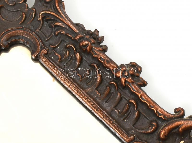 Régi fém, tükör / képkeretnek is használható, falra akasztható, szép állapotban, neorokkokós, puttós és lovag motívummal, 14×10 / 33×22 cm