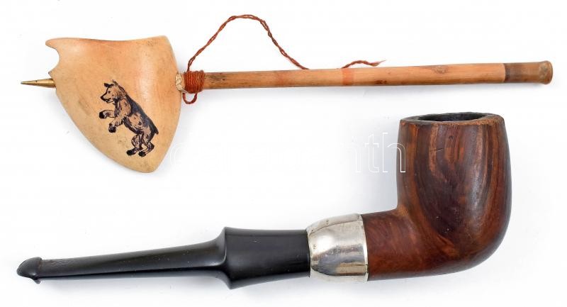 Régi pipa, jelzett angol, + szipka tartó festett medve dekorral XX. sz. eleje