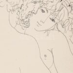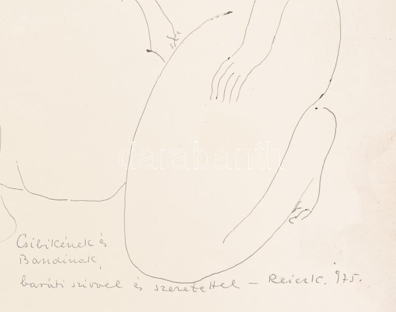 Reich Károly (1922-1986): Szerelmesek. Toll, papír, jelzett, Reich Károly autográf ajándékozási soraival Ury Ibolya (1924-2009), a Műcsarnok tudományos főmunkatársa és férje részére 1975-ből. 29×23 cm keretben / pen on paper, signed, with autograph deicat