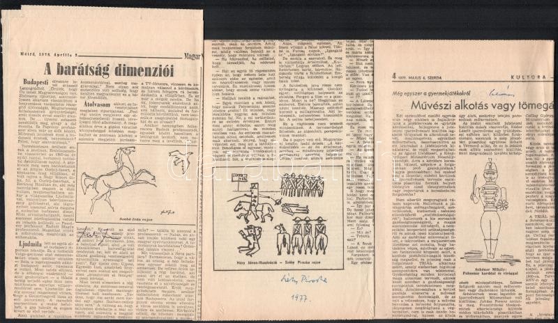 Reich Károly, Hincz Gyula, Kass János, Szabó Iván, Széky Piroska, Schéner Mihály autográf aláírása újság lapokon rájuk vonatkozó cikkek mellett.