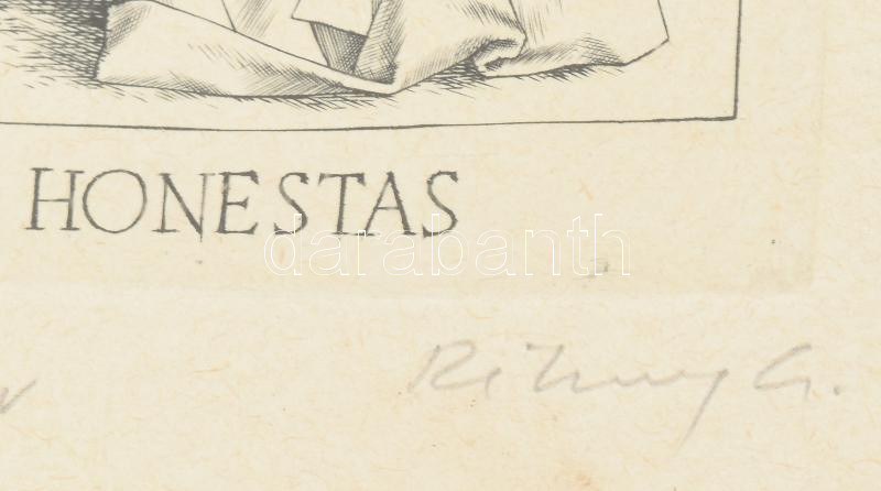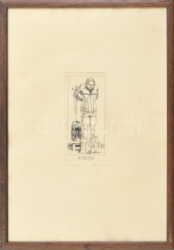 Rékassy Csaba (1937-1989): Honestas (erények sorozat). Rézmetszet, merített papír, jelzett, művészpéldány EA I/XV. számozással, üvegezett fakeretben, apró foltokkal, 15,5×8 cm / engraving on paper, signed, EA I/XV, framed<a href="https://www.daraban