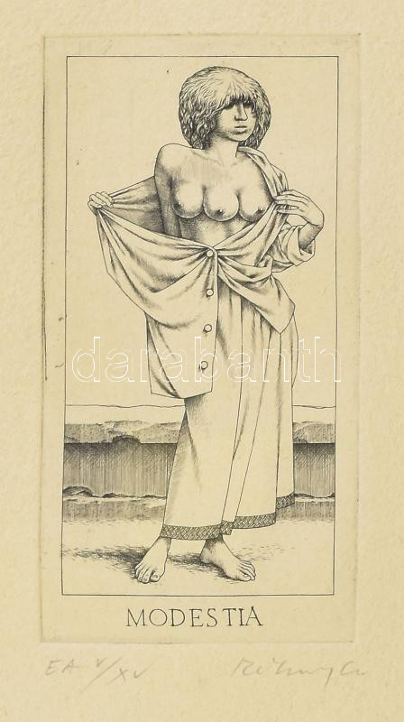 Rékassy Csaba (1937-1989): Modestia (erények sorozat). Rézmetszet, merített papír, jelzett, művészpéldány EA V/XV. számozással, üvegezett fakeretben, 15,5×8 cm / engraving on paper, signed, EA V/XV, framed<a href="https://www.darabanth.com/hu/nagyau
