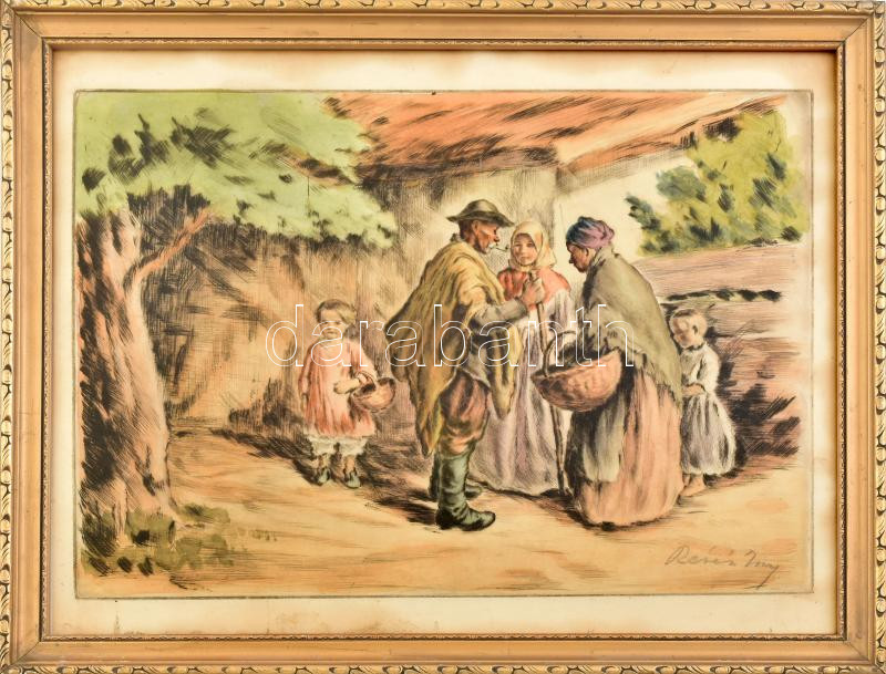 Révész Imre (1859-1945): Vásár, színezett rézkarc, papír, jelzett, kissé sérült. Üvegezett dekoratív keretben, 34×46 cm<a href="https://www.darabanth.com/hu/gyorsarveres/432/kategoriak~Festmenyek-es-grafikak/Festmenyek-es-grafikak~500023/Revesz-Imre