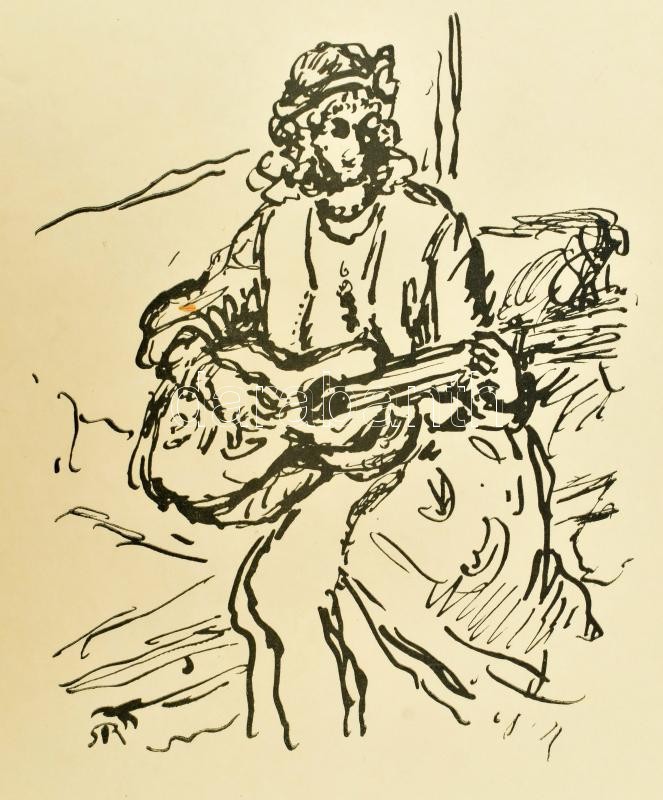 Rippl-Rónai József (1861-1927): Gitáros 1913. Cinkográfia , papír, jelzett a cinkográfián, lapméret 26×35,5 cm csak 200 pld! + Hozzá a grafika korabeli számozott karton mappája (Fünfzig Handzeichnungen. Könyves Kálmán Rt. Budapest 1913.). 13/200 sorszámma