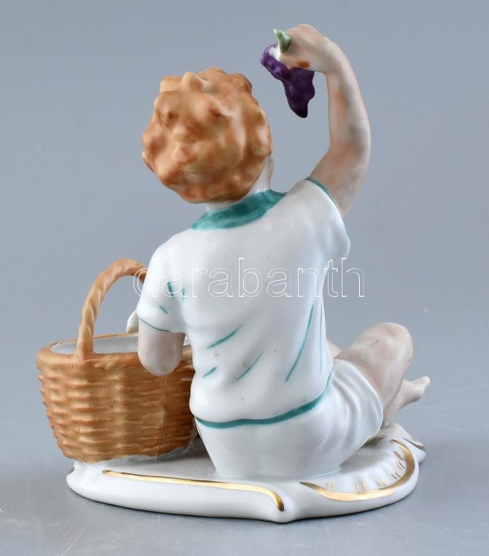 Román porcelán fiú szőlőfürttel, kézzel festett, jelzett, kopásnyomokkal, m: 14,5 cm