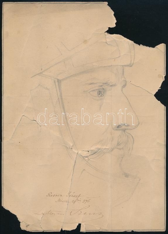 Róna, szül. Rosner József (1861-1939): Sisakos portré, 1876. Ceruza, papír. Jelzett (Rosner). Lap alján olvashatatlan, feltehetően Róna József tanárának aláírásával. Sérült, szakadt, hiányos. 19×21,5 cm<a href="https://www.darabanth.com/hu/gyorsarve