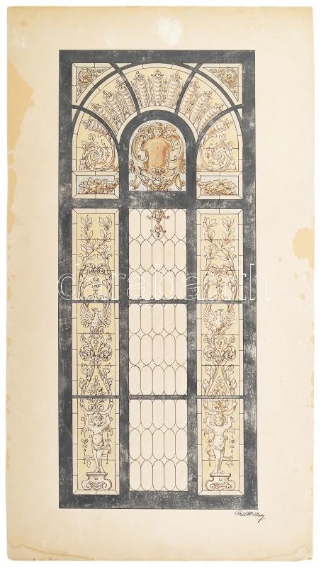 Róth Miksa (1865-1944): Üvegablak terv. Akvarell, tus, papír, jelezve jobbra lent, lap alján Róth Miksa szárazbélyegzővel. Lap széle kissé foltos és kissé sérült, rajz ép, kartonra kasírozva, 41×18 cm / watercolour and ink on paper, signed, on cardboard,