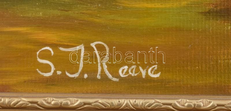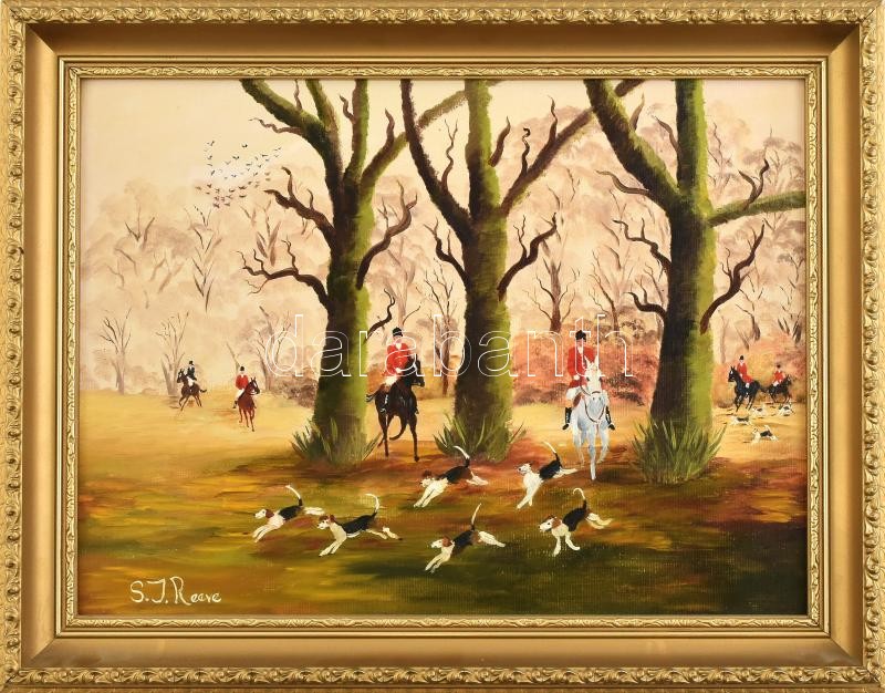 S. J. Reeve (?-): Vadászatról hazatérők. Olaj, karton, jelzett. Dekoratív fa keretben, 30×40 cm