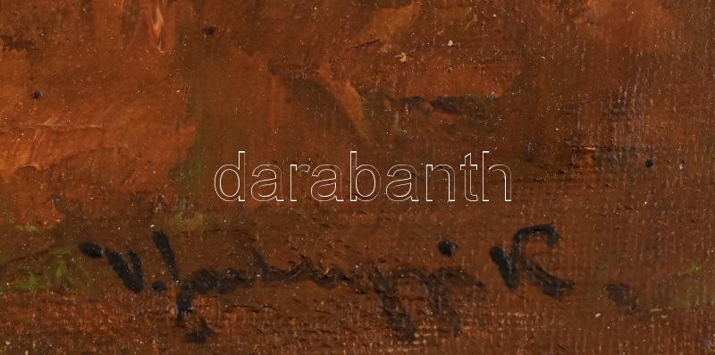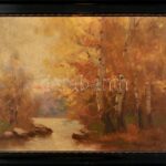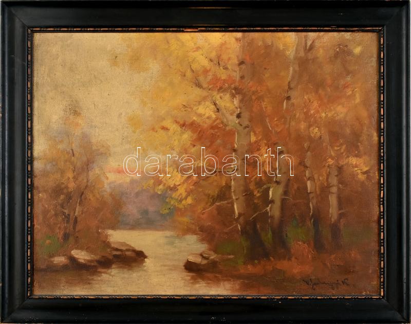 Sashegyi Kálmán, Vodicai (1886-1940): Őszi erdő. Olaj, vászon kartonon, jelzett. Dekoratív, kissé sérült fa keretben, 35×50 cm<a href="https://www.darabanth.com/hu/gyorsarveres/413/kategoriak~Festmenyek-es-grafikak/Festmenyek-es-grafikak~500001/Sash