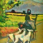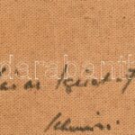 Schéner Mihály (1923-2009): (…) Ígéret-Földjére. Olaj, farost, jelezve jobbra lent. Hátoldalán autográf felirattal. 70×50 cm