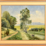 Schöpe, Bruno (1890-1964): Zöldellő táj. Olaj, farost. Dekoratív, kissé sérült fakeretben. 40×50 cm.<a href="https://www.darabanth.com/hu/gyorsarveres/438/kategoriak~Festmenyek-es-grafikak/Festmenyek-es-grafikak~500001/Schope-Bruno-1890-1964-Zoldell