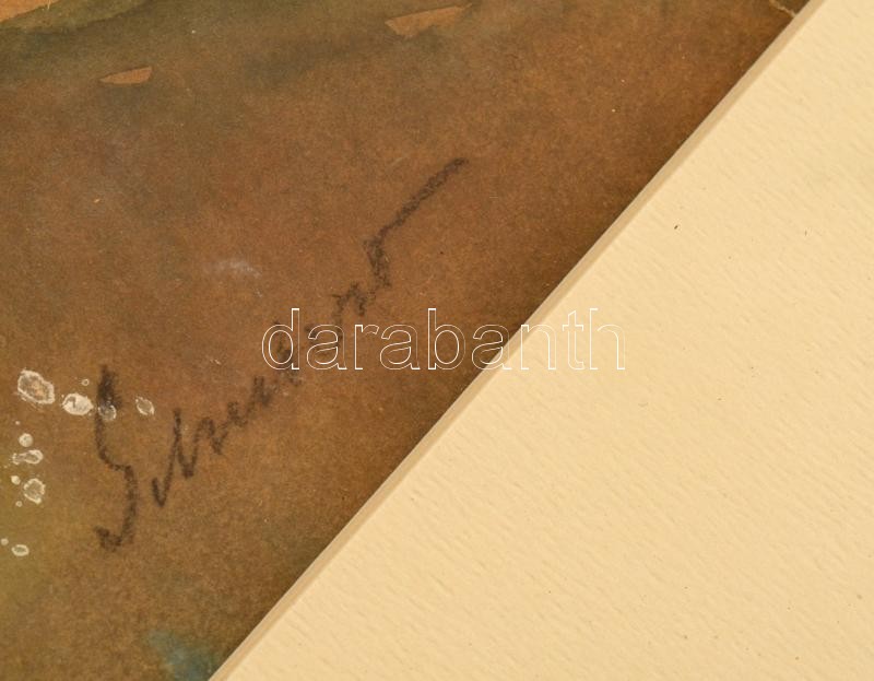 Schubert Ernő (1903-1960): Fenyves. Akvarell, papír, jelzett, kissé sérült, hátoldalán hagyatéki pecséttel, üvegezett fakeretben, 39,5×27 cm<a href="https://www.darabanth.com/hu/gyorsarveres/436/kategoriak~Festmenyek-es-grafikak/Festmenyek-es-grafik