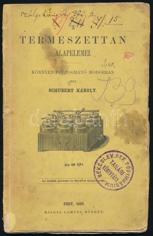 Schubert Károly: A természettan alapelemei. Könnyen fölfogható modorban Az ötödik javított kiadás után. Bp., 1865, Lampel R. Könyvkiadása. Kiadói, kissé sérült papírkötés