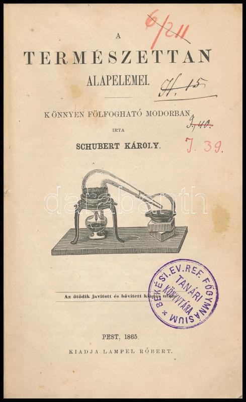 Schubert Károly: A természettan alapelemei. Könnyen fölfogható modorban Az ötödik javított kiadás után. Bp., 1865, Lampel R. Könyvkiadása. Kiadói, kissé sérült papírkötés<a href="https://www.darabanth.com/hu/gyorsarveres/417/kategoriak~Konyvek/Konyv