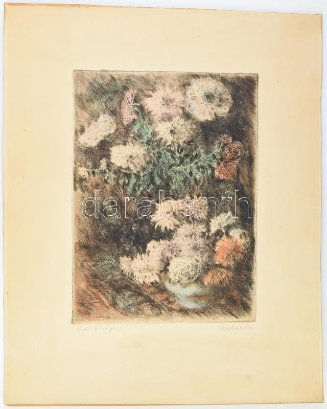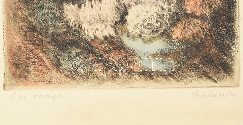 Scultéty Éva (1917-2001): Őszi virágok, színezett rézkarc, papír, jelzett, kartonra kasírozva, 33,5×34,5 cm<a href="https://www.darabanth.com/hu/gyorsarveres/438/kategoriak~Festmenyek-es-grafikak/Festmenyek-es-grafikak~500001/Scultety-Eva-1917-2001-