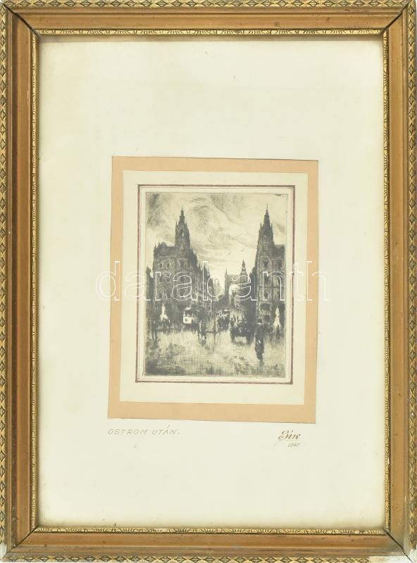 Sík jelzéssel: Ostrom után (Ferenciek tere, Bp.). Rézkarc, papír, jelzett. Üvegezett, sérült fa keretben, 18×13,5 cm<a href="https://www.darabanth.com/hu/gyorsarveres/410/kategoriak~Festmenyek-es-grafikak/Festmenyek-es-grafikak-jelzessel-jelzes-nelk