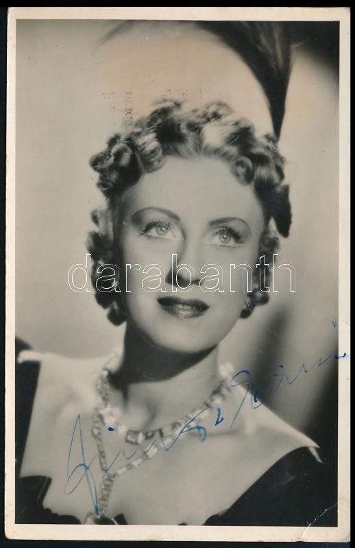 Simor Erzsi (1913-1977) a Gyurkovics fiúk c. filmben, fotó, rajta a színésznő autográf aláírásával, hátoldalán ragasztónyomokkal, 14×9 cm<a href="https://www.darabanth.com/hu/gyorsarveres/417/kategoriak~Mutargy-papirregiseg-egyeb/Alairas~21/Simor-Er