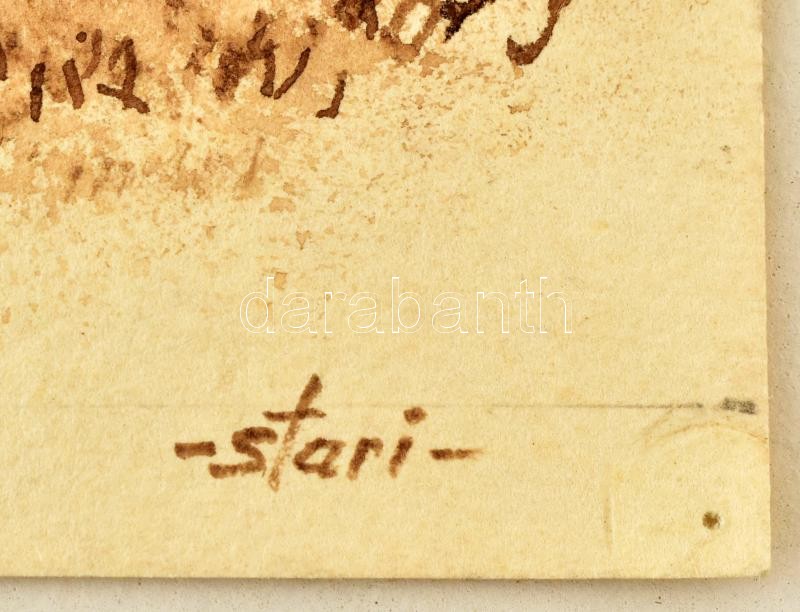 Sostarics Lajos (1896-1968): Kaszás utca. Óbuda sorozat, 1960-as évek. Diópác, papír. Jelzett, kartonra kasírozva, a karton a szélein sérült, 29×22 cm<a href="https://www.darabanth.com/hu/gyorsarveres/413/kategoriak~Festmenyek-es-grafikak/Festmenyek