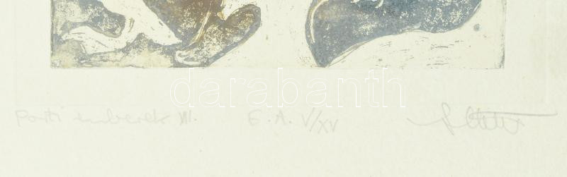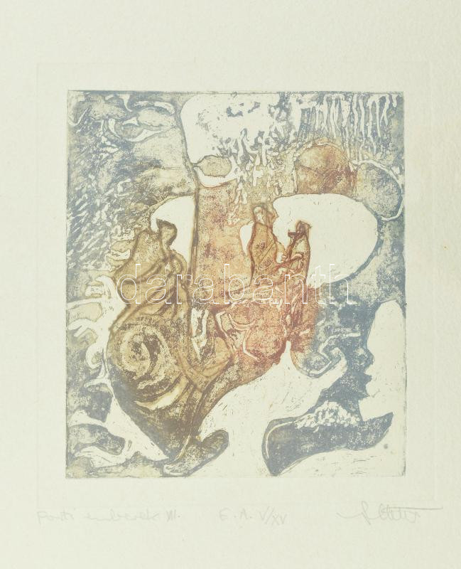 Stettner Béla (1928-1984): Parti emberek VII. Színes rézkarc, papír, jelzett, művészpéldány E.A. V/XV számozással, üvegezett fakeretben, 20×18 cm<a href="https://www.darabanth.com/hu/gyorsarveres/439/kategoriak~Festmenyek-es-grafikak/Festmenyek-es-g