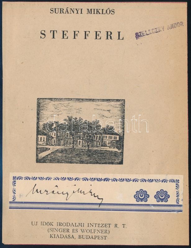 Surányi Miklós (1882-1936) újságíró, író autográf aláírása Stefferl c. könyvének kivágott címlapjára ragasztva<a href="https://www.darabanth.com/hu/gyorsarveres/420/kategoriak~Mutargy-papirregiseg-egyeb/Alairas~500020/Suranyi-Miklos-1882-1936-ujsagi