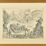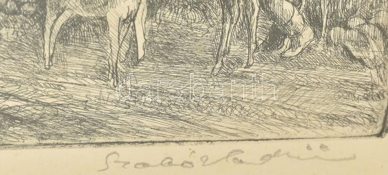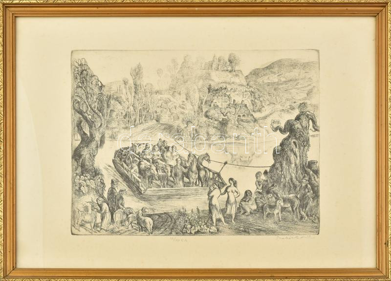 Szabó Vladimír (1905-1991): Átkelés (cím nélkül). Rézkarc, papír, jelzett, művészpéldány VI/XV E.A. számozással. Dekoratív, üvegezett fakeretben, lapon apró foltokkal, 29×39 cm<a href="https://www.darabanth.com/hu/gyorsarveres/435/kategoriak~Festmen