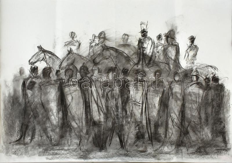 Szalay Pál (1953-2015): Lovasok. Szén, papír. Jelzés nélkül. Hátoldalán tanulmányrajzok. Hajtva. 70×100 cm<a href="https://www.darabanth.com/hu/gyorsarveres/430/kategoriak~Festmenyek-es-grafikak/Festmenyek-es-grafikak~500003/Szalay-Pal-1953-2015-Lov