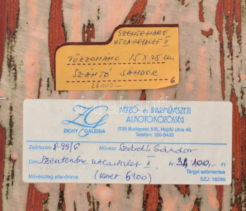 Szántó Sándor (1945-): Szentendre utcarészlet II. Tűzzománc, fém, jelzett a hátoldalán, sérült (repedésekkel), fakeretben, 25×25 cm<a href="https://www.darabanth.com/hu/gyorsarveres/436/kategoriak~Festmenyek-es-grafikak/Festmenyek-es-grafikak~500001