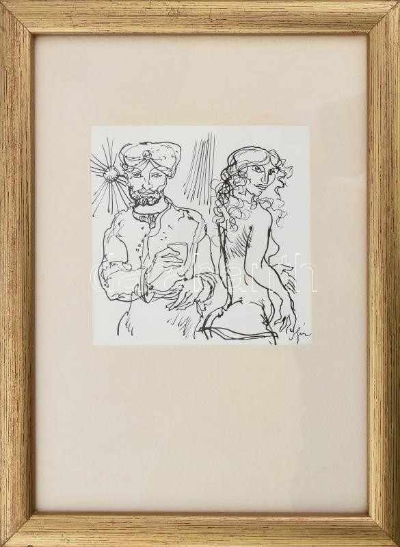 Szász Endre (1926-2003) Ezeregyéjszaka meséi. sorozat egy része. Tus, papír, szép üvegezett fakeretben, hátoldalon: Művészetileg ellenőrzött pecsét jelzett. 10×9 cm<a href="https://www.darabanth.com/hu/gyorsarveres/439/kategoriak~Festmenyek-es-grafi