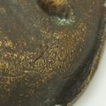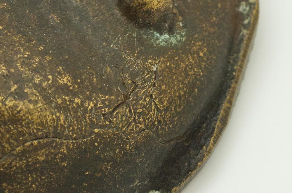 Kikiáltási ár: 5 000 FtRéz tálka, préselt és gravírozott, jelzés nélkül, kopott, d:13,5 cm