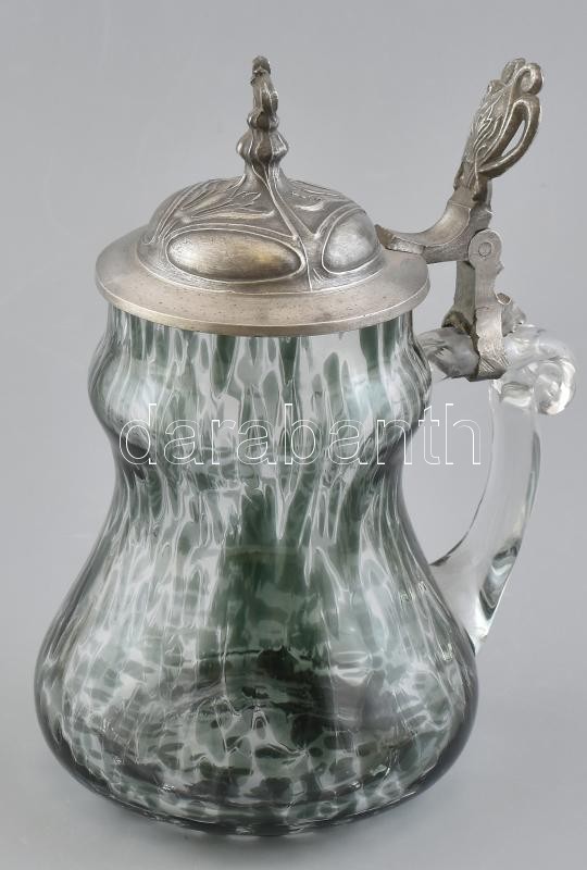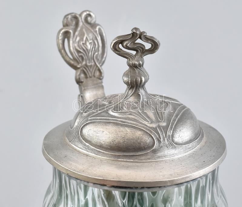 Szecessziós üveg söröskorsó ón fedéllel, kis kopásnyomokkal, m: 20 cm