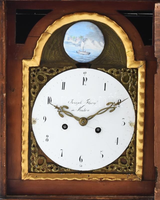 Szekrényóra, (kandallóóra) XVIII. sz. Nyitra. Joseph Flory in Neutra órásmester felirattal, felesütős szerkezet, egynapos ingajárat, zománcfestett, arab számos számlap, felső mezőben viharos tengeri hajós jelenettel díszített, mahagóni színűre pácolt fa h