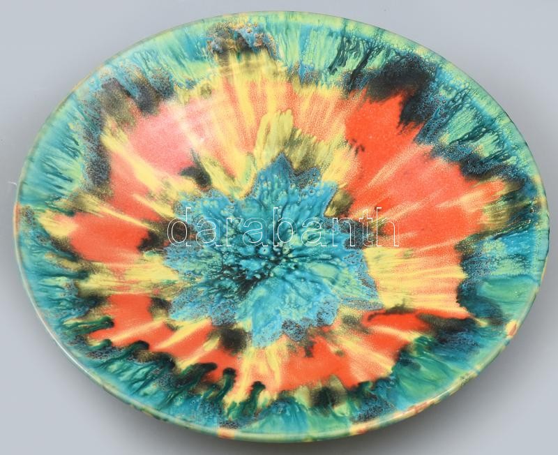 Színes mázakkal festett retró kerámia tányér, kopásnyomokkal, jelzés nélkül, d: 28 cm<a href="https://www.darabanth.com/hu/gyorsarveres/421/kategoriak~Porcelan-keramia-uveg/Keramiak~500005/Szines-mazakkal-festett-retro-keramia-tanyer-kopasnyomokkal-