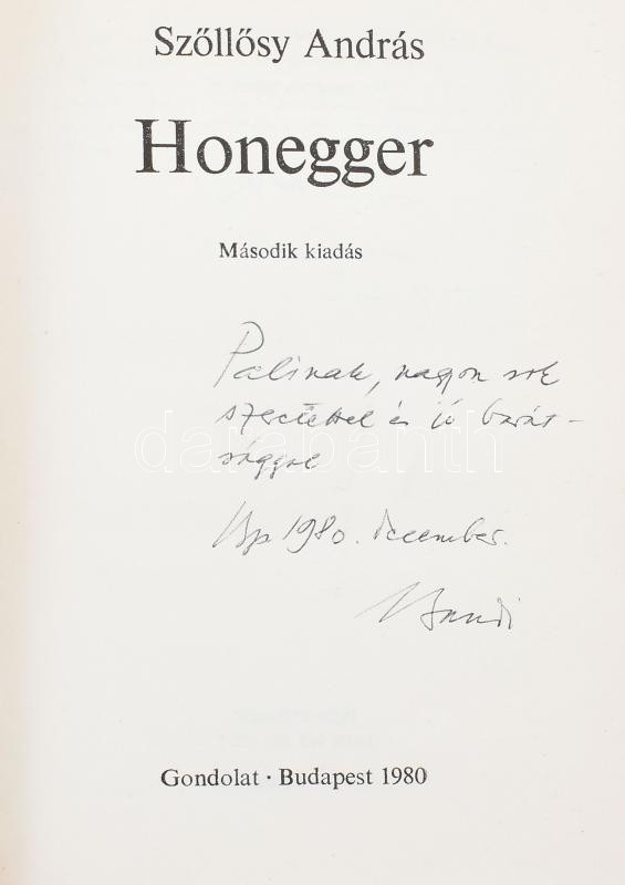 Szőllősy András: Honegger. A szerző, Szőllősy András (1921-2007) Kossuth- és Széchenyi-díjas magyar zeneszerző, zenetudós által Gyöngy Pál (1902-1990) zeneszerző, dalszerző részére DEDIKÁLT példány. Zenei kiskönyvtár. Bp., 1980., Gondolat. 2. kiadás. Kiad