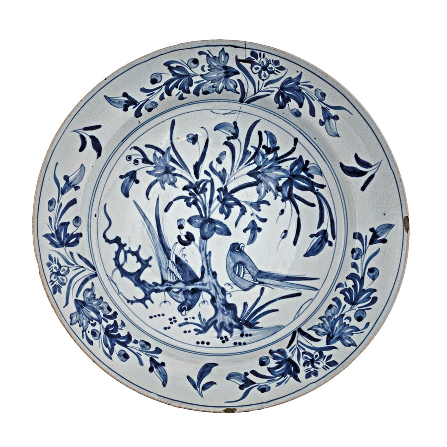 Delft, 18. sz., ónmázas fajansz, régi javítással, sérült, d: 34, 5 cm