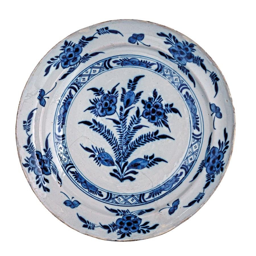 Delft, 18. sz., ónmázas fajansz, jelezve az alján, sérült, javított, d: 34, 5 cm