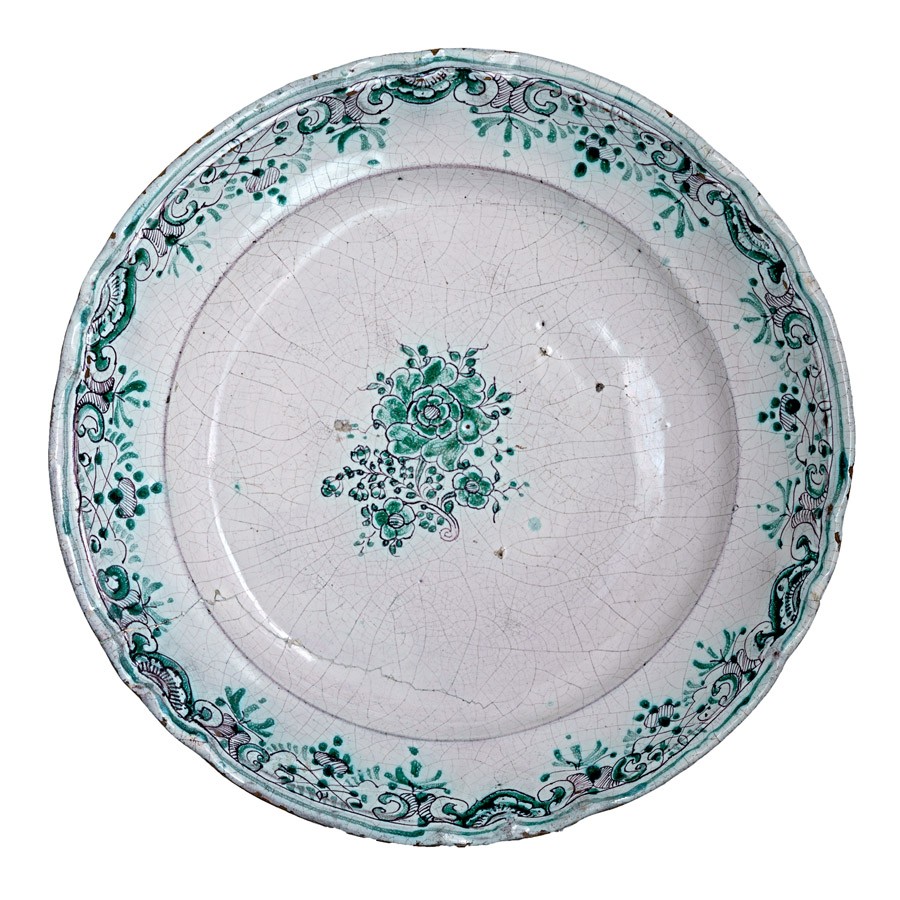 Holics (?), 18. sz. vége, ónmázas fajansz, restaurált, d: 30 cm